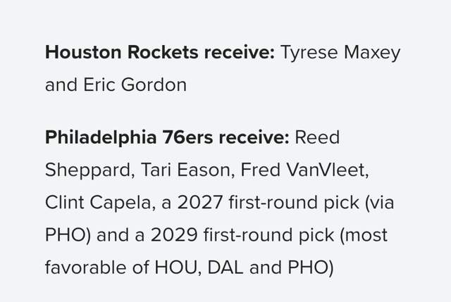 火箭送出谢泼德、伊森、范弗利特、卡佩拉、2027年首轮(来自太阳)、2029年首轮(火箭、独行侠、太阳中位次最好的一个),得到76人的马克西和埃里克-戈登