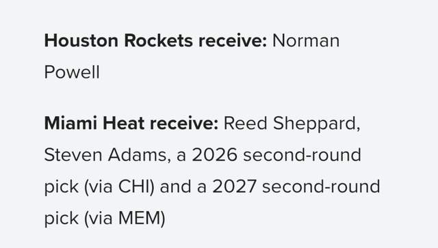 火箭送出谢泼德、、2026年次轮(来自公牛)、2027年次轮(来自灰熊),得到热火的诺曼-鲍威尔