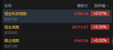 今日港股三大指数集体高开,恒生指数涨0.30%,报25711.07点,恒生科指涨0.57%,国企指数涨0.22%。盘面上,科网股涨多跌少,网易涨超3%,京东涨超2%,小米跌超0.5%;黄金股普涨,珠峰黄金涨超4%;汽车股活跃,蔚来涨超2%;苹果概念普遍上涨,丘钛科技涨超3%;大行科工上市首日高开,涨超36%。